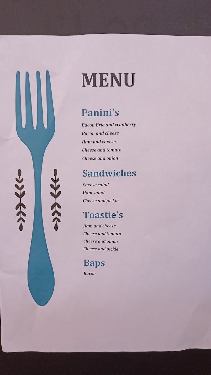 Overall, the menu is designed for a range of dining purposes including breakfast, coffee breaks, and light meals, providing quick and easily ordered food items alongside beverage options typically found in a café setting.